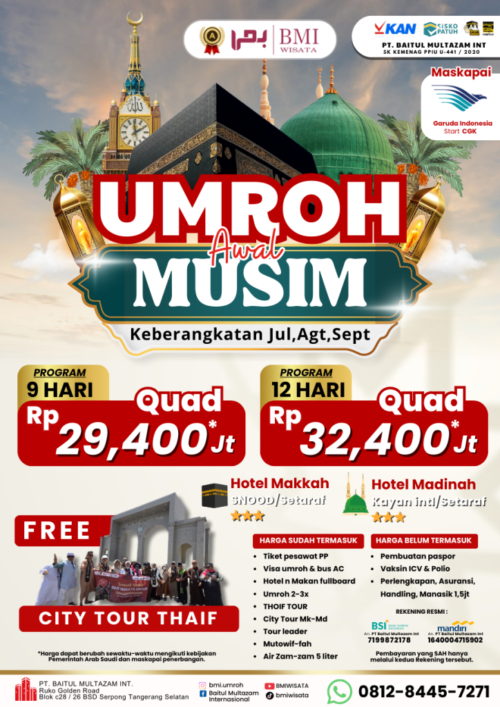 Wujudkan perjalanan ibadah yang tenang, nyaman, dan berkesan bersama penyelenggara umrah resmi dan terpercaya. BMI Wisata telah mendampingi jamaah sejak 2013 dengan pelayanan yang amanah dan profesional.